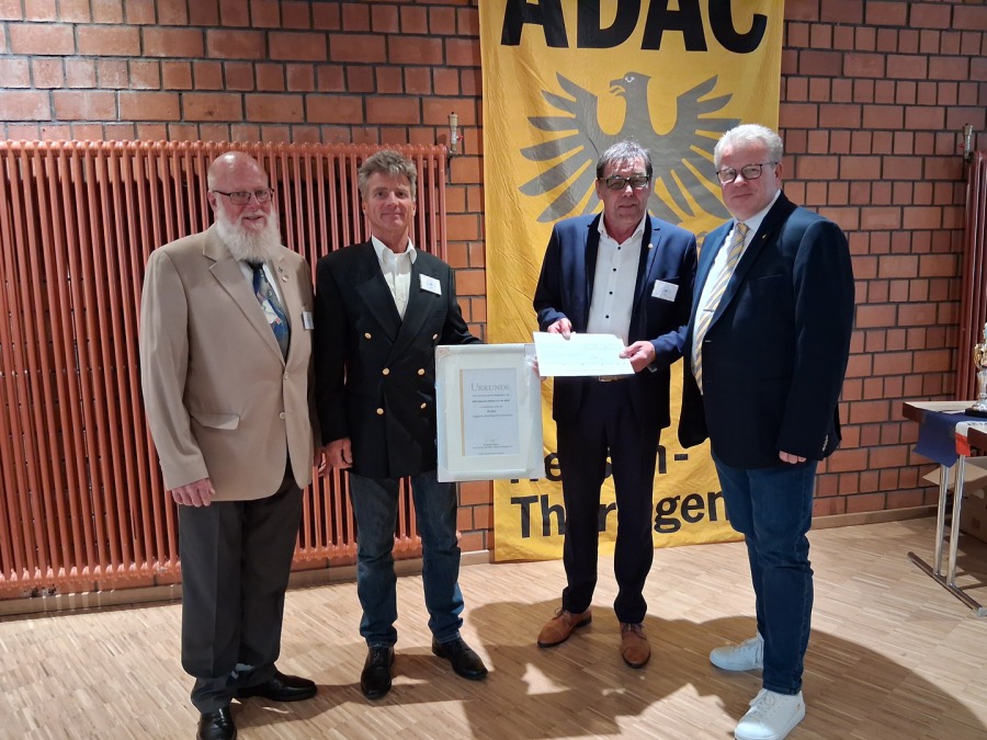 Übergabe der Urkunde des ADAC Hessen-Thüringen durch das Vorstandsmitglied für Motorsport René Burkard(r.) an den 1.Vorsitzenden Cornelis Witte(2.v.l.), 2.Vorsitzenden Paul Kuppe(l.) und Hans Günter Christmann Schatzmeister(2.v.r.)